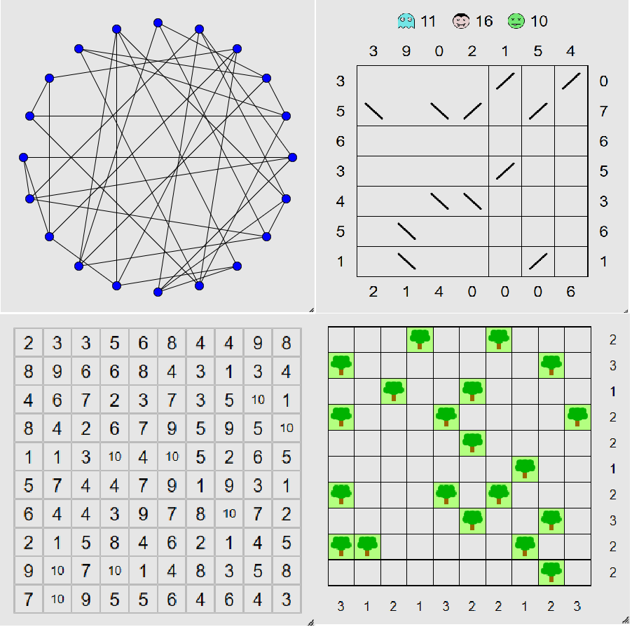 В Tents (моя любимая, пожалуй), надо расставить палатки рядом с деревьями (не по диагонали), так, чтобы у каждого дерева была своя палатка, и чтобы число палаток в каждой строке и столбце совпадало с написанным на полях.